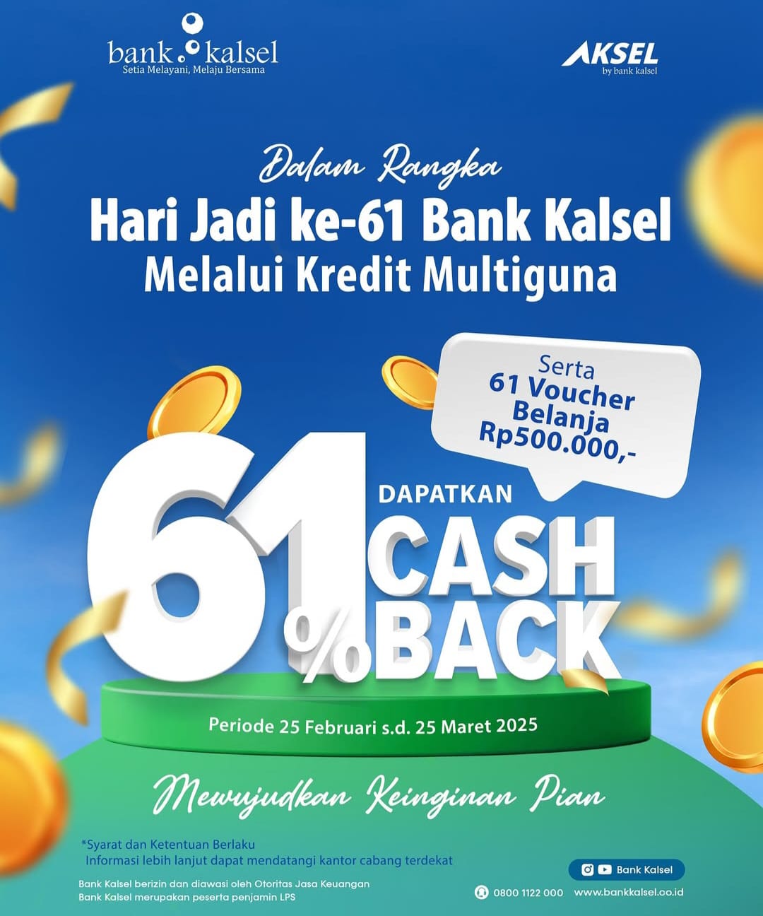 BANJARMASIN, SuaraBorneo.com – Halo sobat Bank kalsel spesial Hari Jadi ke-61 Bank Kalsel Dapatkan cashback 61% dan 61 voucher belanja senilai Rp500.000 hanya dengan mengajukan Kredit Multiguna selama periode 25 Februari – 25 Maret 2025.